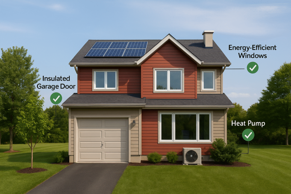 “Modern Canadian energy-efficient home featuring solar panels, triple-pane windows, insulated garage door, and heat pump system — showcasing sustainable living and government rebate opportunities.”